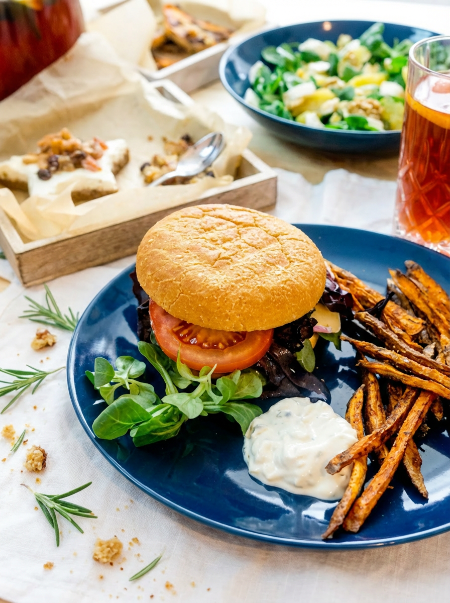 Burger lassen sich super vorbereiten und gehen super fix. Jeder kann beim Schnippeln helfen und wenn ihr es ganz unkompliziert wollt, stellt ihr einfach die einzelnen Belage und Saucen sowie Buns und Patties in die Mitte auf den Tisch und jeder gestaltet seinen Burger nach eigenen Wünschen und Vorlieben selbst. Aber auch fertig belegte Burger sind im Aufwand nicht schlechter. Das Schöne ist, hier kann nicht viel kalt werden und selbst wenn, ist das kein Beinruch. Spontanität wird hier demnach sehr groß geschrieben. Hier gehts zum Rezept: